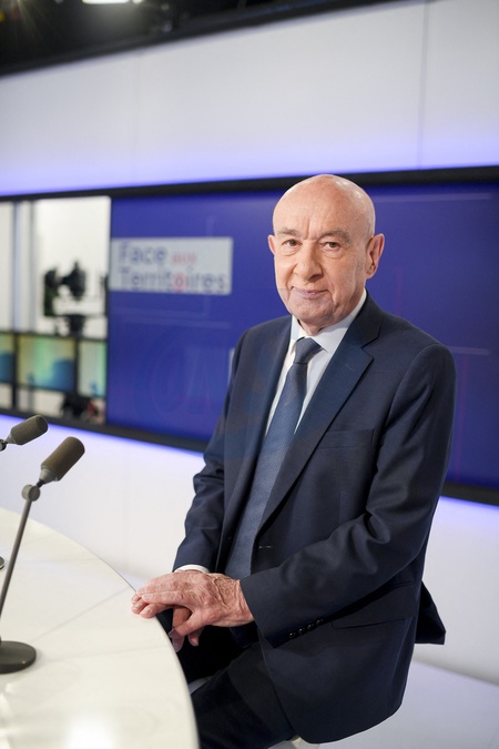 Exclusif - Claude Malhuret invité de l'émission "Face aux territoires" présentée par Cyril Viguier dans les studios de TV5 Monde à Paris
