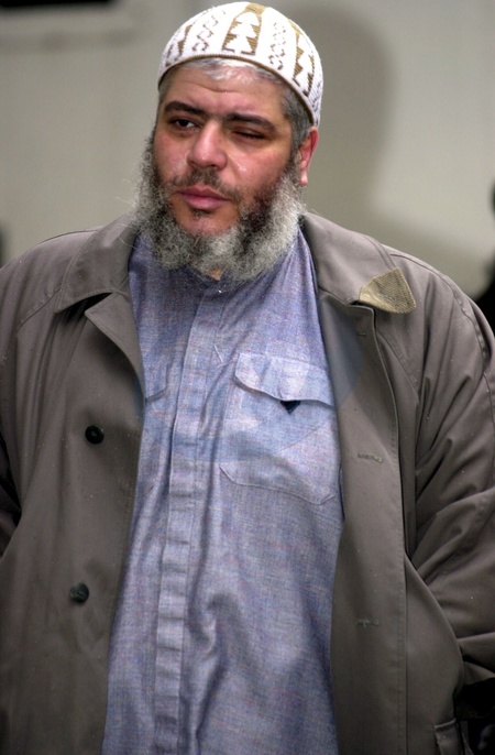 20.01.03PIC SHOWS: MUSLIM CLERIC, ABU HAMZA, A RADICAL ISLAMIC PREACHER WHO IS BASED AT THE NORTH LONDON, FINSBURY PARK MOSQUE. HE IS PICTURED AT THE OLD BAILEY TODAY WHERE HE WAS CALLED AS A WITNESS IN THE TRIAL OF MUSLIM CLERIC, ABDULLAH EL-FAISAL, WHO IS CHARGED WITH SOLICITING TO MURDER. POLICE HAVE TODAY ARRESTED SEVEN PEOPLE AT THE FINSBURY PARK MOSQUE, NORTH LONDON IN CONNECTION WITH INVESTIGATIONS INTO THE RICIN TOXIN FIND-SEE STORYPIC BY:, Credit:BEN GRAVILLE / Avalon