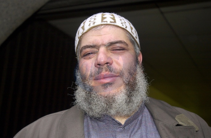 20.01.03PIC SHOWS: MUSLIM CLERIC, ABU HAMZA, A RADICAL ISLAMIC PREACHER WHO IS BASED AT THE NORTH LONDON, FINSBURY PARK MOSQUE. HE IS PICTURED AT THE OLD BAILEY TODAY WHERE HE WAS CALLED AS A WITNESS IN THE TRIAL OF MUSLIM CLERIC, ABDULLAH EL-FAISAL, WHO IS CHARGED WITH SOLICITING TO MURDER. POLICE HAVE TODAY ARRESTED SEVEN PEOPLE AT THE FINSBURY PARK MOSQUE, NORTH LONDON IN CONNECTION WITH INVESTIGATIONS INTO THE RICIN TOXIN FIND-SEE STORYPIC BY: L, Credit:NICK RAZZELL / Avalon