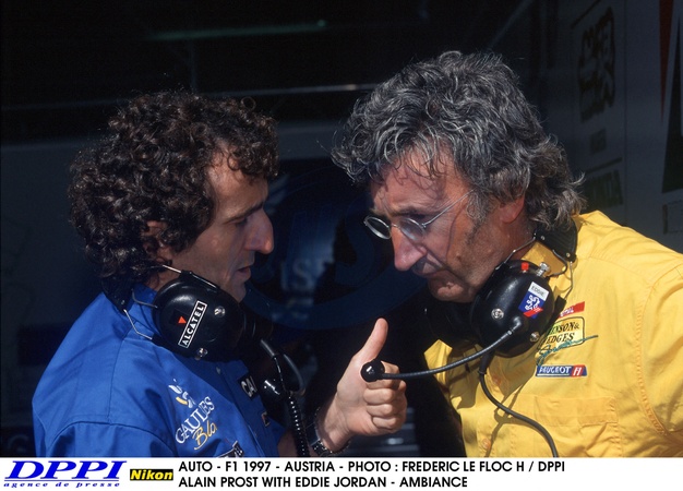 AUTO - F1 1997 - AUSTRIA GP - PHOTO : FREDERIC LE FLOC H / DPPI ALAIN PROST WITH EDDIE JORDAN - AMBIANCE PORTRAIT © Dppi / Psnew / Bestimage