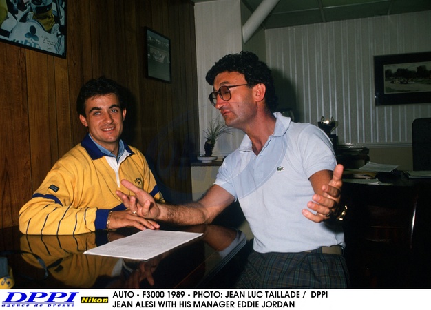 AUTO - F3000 1989 - PHOTO: JEAN LUC TAILLADE / DPPI JEAN ALESI WITH HIS MANAGER EDDIE JORDAN - AMBIANCE PORTRAIT © Dppi / Psnew / Bestimage