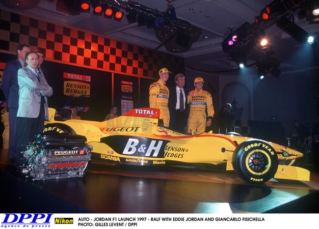 AUTO - JORDAN F1 LAUNCH 1997 - RALF SCHUMACHER WITH EDDIE JORDAN AND GIANCARLO FISICHELLA / JORDAN PEUGEOT - AMBIANCE PHOTO: GILLES LEVENT / DPPI PORTRAIT © Dppi / Psnew / Bestimage