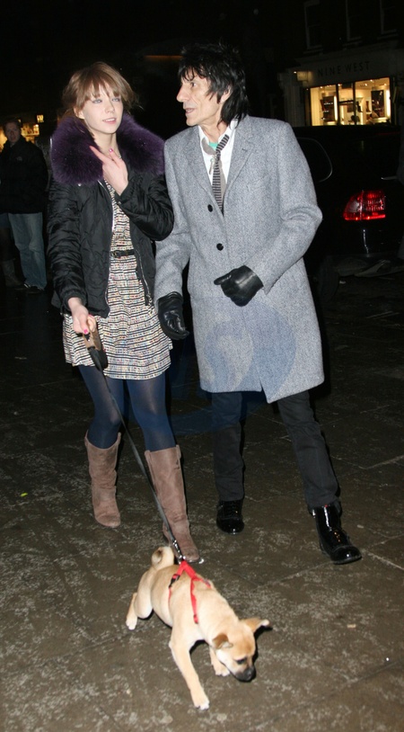 Ronnie Wood i Ekaterina Ivanova spaceruja z pieskiem, Londyn
