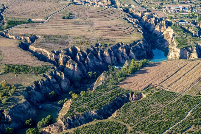 Aerial view of valleys formed by erosion on the loess plateau in the volcano geologic park in Datong in north China's Shanxi province Friday, Oct. 04, 2024., Credit:JI ZHEZHE / Avalon