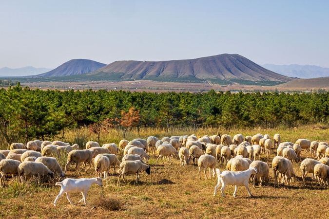 Sheep graze near an eroded extinct volcano in the volcano geologic park in Datong in north China's Shanxi province Friday, Oct. 04, 2024., Credit:JI ZHEZHE / Avalon