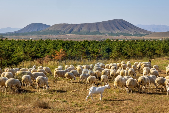 Sheep graze near an eroded extinct volcano in the volcano geologic park in Datong in north China's Shanxi province Friday, Oct. 04, 2024., Credit:JI ZHEZHE / Avalon
