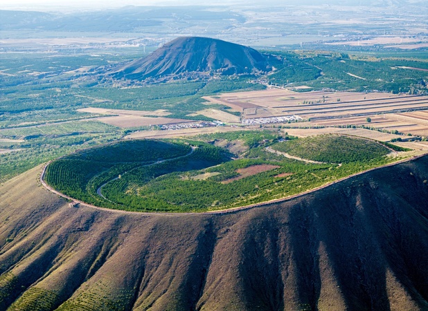 Aerial view of an eroded extinct volcano in the volcano geologic park in Datong in north China's Shanxi province Friday, Oct. 04, 2024., Credit:JI ZHEZHE / Avalon