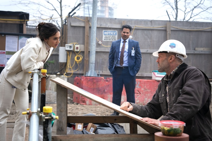 Arianna Rivas, Michael Peña, Jason Statham, "A Working Man" (2025), Credit:Dan Smith/Amazon MGM Studios / Avalon