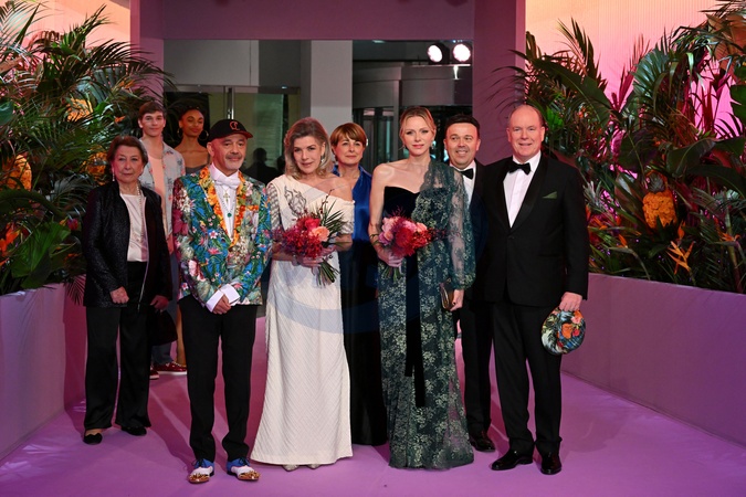 No Tabloïds - Christian Louboutin, la princesse Caroline de Hanovre, la princese Charlene de Monaco et le prince Albert II de Monaco durant la 69ème édition du Bal de la Rose dans la Salle des Étoiles du Sporting Monte-Carlo à Monaco, le 29 mars 2025. Cette année encore, c'est Christian Louboutin qui est le directeur artistique de l'événement dont le thème est "Sunset Bal" dans un décor qui a plongé les invités dans les Caraibes. © Bruno Bebert / Pool Monaco / Bestimage No Tabloïds - The Princely Family of Monaco at the 69th edition of the Bal de la Rose on the theme ‘Sunset Bal' in the Salle des Etoiles at the Sporting Monte-Carlo in Monaco on march 29 2025
