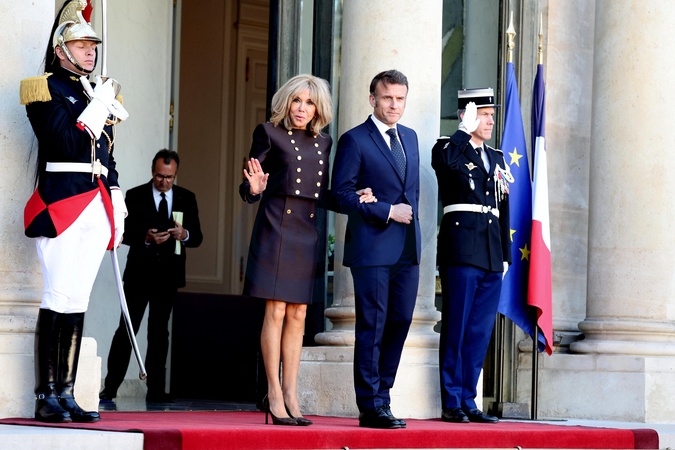 Powitanie Ich Królewskich Mości Króla Fryderyka i Królowej Danii Marii przez Prezydenta Republiki Emmanuela Macrona i jego małżonkę Pierwszą Damę Brigitte Macron na spotkaniu w Pałacu Prezydenckim Elizejskim w Paryżu
