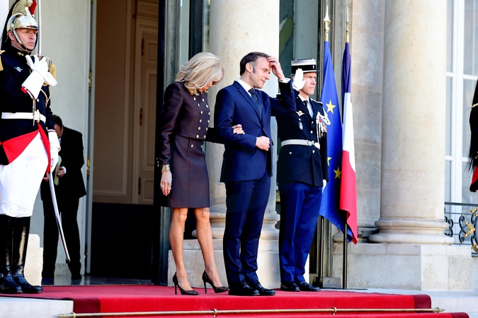 Powitanie Ich Królewskich Mości Króla Fryderyka i Królowej Danii Marii przez Prezydenta Republiki Emmanuela Macrona i jego małżonkę Pierwszą Damę Brigitte Macron na spotkaniu w Pałacu Prezydenckim Elizejskim w Paryżu