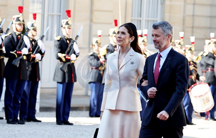 Powitanie Ich Królewskich Mości Króla Fryderyka i Królowej Danii Marii przez Prezydenta Republiki Emmanuela Macrona i jego małżonkę Pierwszą Damę Brigitte Macron na spotkaniu w Pałacu Prezydenckim Elizejskim w Paryżu
