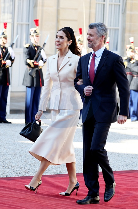 Accueil de leurs Majestés le roi Frederik et la reine Mary de Danemark par le président de la République français et de sa femme la Première Dame française pour un entretien, dans la cour d'Honneur du palais présidentiel de l'Elysée, à Paris, France, le 31 mars 2025. © Dominique Jacovides/Bestimage Welcoming Their Majesties King Frederik and Queen Mary of Denmark by French President and his wife French First Lady for a meeting, at the Elysée presidential Palace in Paris, France, on March 31, 2025.