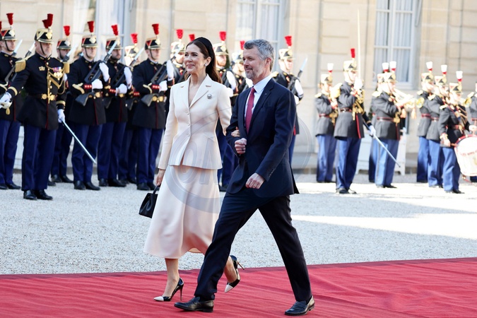 Powitanie Ich Królewskich Mości Króla Fryderyka i Królowej Danii Marii przez Prezydenta Republiki Emmanuela Macrona i jego małżonkę Pierwszą Damę Brigitte Macron na spotkaniu w Pałacu Prezydenckim Elizejskim w Paryżu