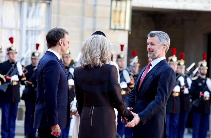 Powitanie Ich Królewskich Mości Króla Fryderyka i Królowej Danii Marii przez Prezydenta Republiki Emmanuela Macrona i jego małżonkę Pierwszą Damę Brigitte Macron na spotkaniu w Pałacu Prezydenckim Elizejskim w Paryżu