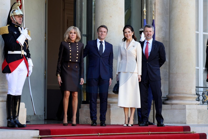 Powitanie Ich Królewskich Mości Króla Fryderyka i Królowej Danii Marii przez Prezydenta Republiki Emmanuela Macrona i jego małżonkę Pierwszą Damę Brigitte Macron na spotkaniu w Pałacu Prezydenckim Elizejskim w Paryżu