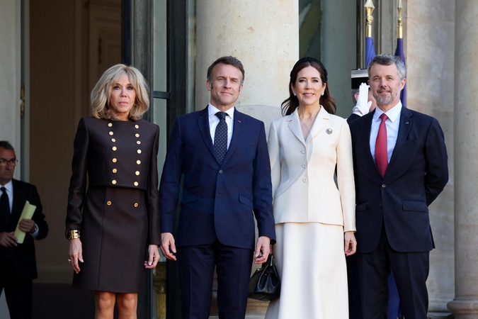 Powitanie Ich Królewskich Mości Króla Fryderyka i Królowej Danii Marii przez Prezydenta Republiki Emmanuela Macrona i jego małżonkę Pierwszą Damę Brigitte Macron na spotkaniu w Pałacu Prezydenckim Elizejskim w Paryżu