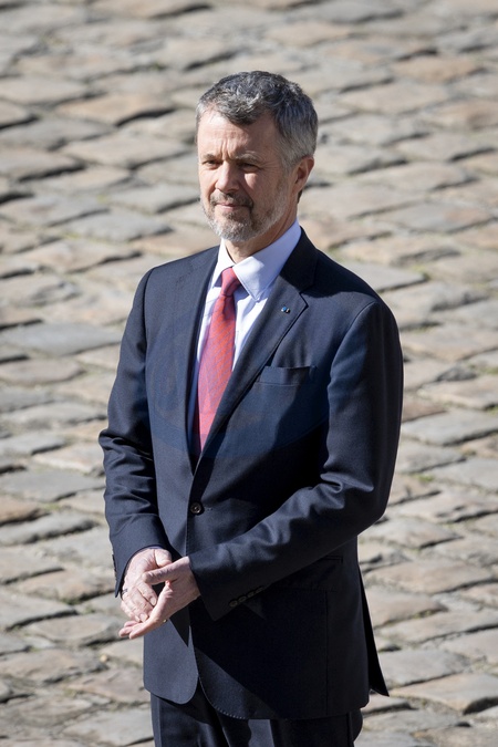 Cérémonie officielle de bienvenue de leurs Majestés le roi Frederik et la reine de Danemark par le président de la République française et de sa femme la Première Dame française à l'Hôtel national des Invalides à Paris, France, le 31 mars 2025. © Cyril Moreau/Bestimage Official welcoming ceremony of Their Majesties King Frederik and Queen of Denmark by French President and his wife French First Lady at the Hôtel National des Invalides in Paris, France, March 31, 2025.