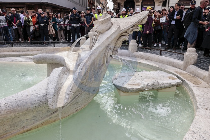 April 16, 2025, Rome, Rm, Italy: Rome Mayor ROBERTO GUALTIERI inaugurates the Barcaccia Fountain in Piazza di Spagna after restoration work over the past three months. This restoration project has so far involved 16 Roman fountains., Credit:Cristiano Minichiello / Avalon