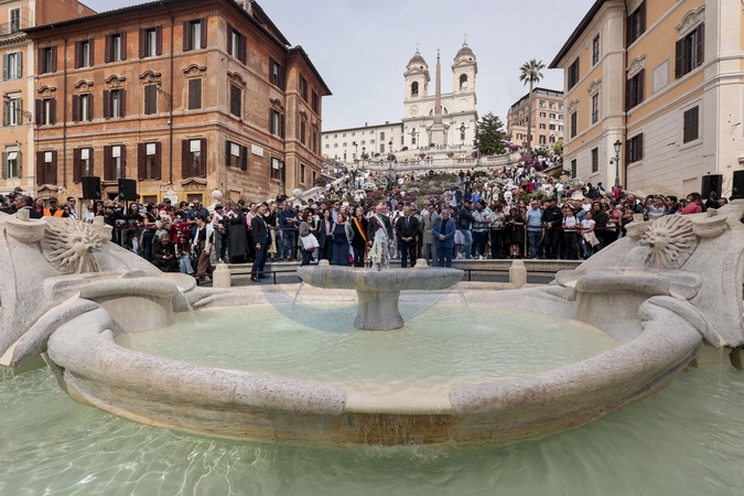 April 16, 2025, Rome, Rm, Italy: Rome Mayor ROBERTO GUALTIERI inaugurates the Barcaccia Fountain in Piazza di Spagna after restoration work over the past three months. This restoration project has so far involved 16 Roman fountains., Credit:Cristiano Minichiello / Avalon
