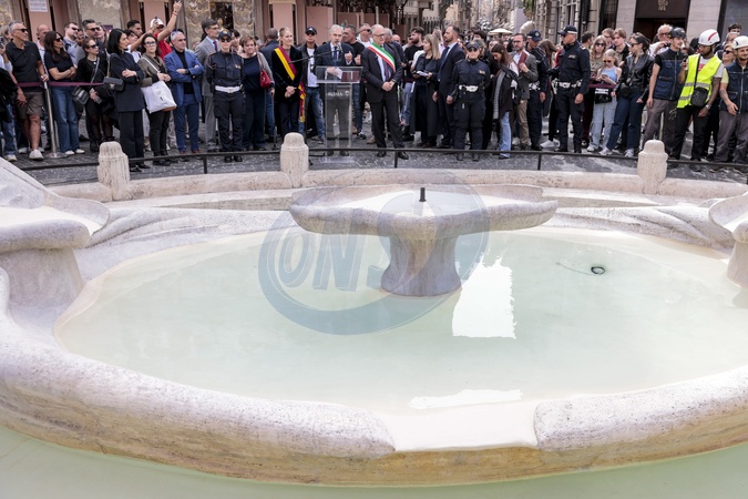 April 16, 2025, Rome, Rm, Italy: Rome Mayor ROBERTO GUALTIERI inaugurates the Barcaccia Fountain in Piazza di Spagna after restoration work over the past three months. This restoration project has so far involved 16 Roman fountains., Credit:Cristiano Minichiello / Avalon
