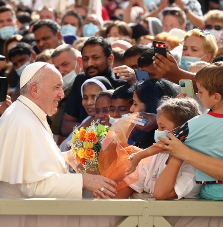 Le pape François lors de ses traditionnelles audiences générales du mercredi en présence du public dans la cour de Saint Damaso au Vatican
