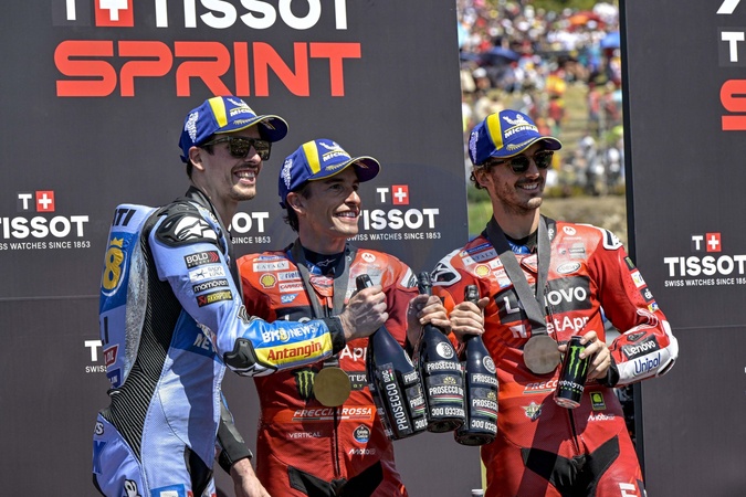 Podium Sprint race MARQUEZ Marc (spa), Ducati Lenovo Team, Ducati Desmosedici GP25, portrait MARQUEZ Alex (spa), Gresini Racing MotoGP, Ducati Desmosedici GP24, portrait BAGNAIA Francesco (ita), Ducati Lenovo Team, Ducati Desmosedici GP25, portrait Sprint race during the 2025 MotoGP Gran Premio Estrella Galicia 0,0 de España Grand Prix Spain Circuit de Jerez - Ángel Nieto on from April 25 to 27, in Jerez, Spain - © DPPI / PsnewZ / Bestimage