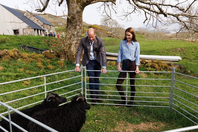 Mull, Scotland, 29 April 2025: The Prince and Princess of Wales, known as the Duke and Duchess of Rothesay when in Scotland, with some Hebridean sheep, during their visit to a local croft on the west coast of Mull to learn about sustainable production and the hospitality industry on the islands., Credit:Robert Perry/Daily Mail Scotland / Avalon