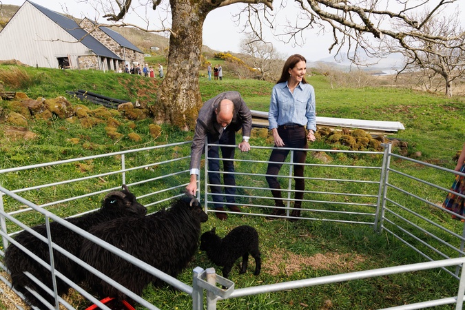 Mull, Scotland, 29 April 2025: The Prince and Princess of Wales, known as the Duke and Duchess of Rothesay when in Scotland, with some Hebridean sheep, during their visit to a local croft on the west coast of Mull to learn about sustainable production and the hospitality industry on the islands., Credit:Robert Perry/Daily Mail Scotland / Avalon