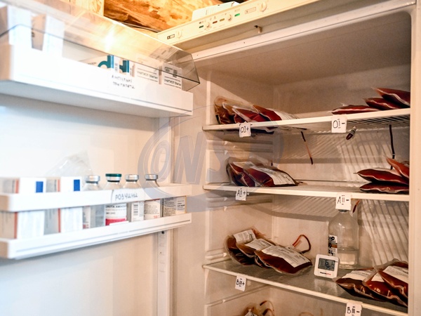 Blood bags and medications are kept in a refrigerator in a surgical unit of an underground hospital in an area of hostilities on April 15, 2025. (Photo by Dmytro Smolienko/Ukrinform), Credit:Dmytro Smolienko / Avalon
