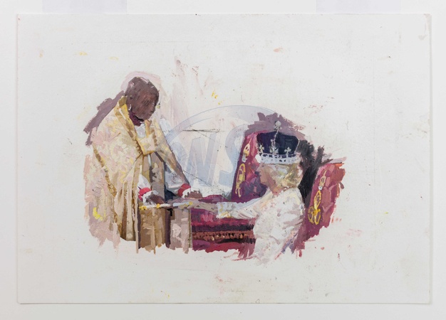 17. 'The Queen rid with doves' by Eileen Hogan Artwork detailing some of the most significant moments of The Coronation weekend have been revealed for the first time, ahead of the second anniversary of the occasion. Their release comes as The King and Queen prepare to unveil the recently completed official Coronation State Portraits.As part of The Coronation celebrations, His Majesty commissioned five artists to capture some of the most significant moments of the weekend. Inviting artists to sketch, paint and draw scenes from The Coronation continues a long tradition of such commissions by othersovereigns and reflects Their Majesties' shared appreciation of the arts and creative industries.The King selected four Royal Drawing School alumni to capture events they witnessed from positions along the procession route.Fraser Scarfe was outside Buckingham Palace and Gideon Summerfield was at Trafalgar Square. Phoebe Stannard was at Westminster Abbey, and artist and illustrator Shana Lohrey was invited to Windsor Castle to capture the atmosphere, crowds and ambience of TheCoronation Concert.Eileen Hogan, an Emeritus Professor at the University of the Arts London and a Trustee of the Royal Drawing School, was commissioned to paint the Coronation Service itself from within Westminster Abbey; making her the first woman to have been appointed in this role., Credit:Eileen Hogan/Buckingham Palace / Avalon
