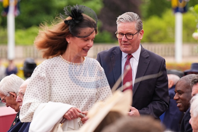 Prime Minister Sir Keir Starmer and his wife wife Lady Victoria arrive ahead of the military procession for the 80th anniversary of VE Day, in honour of those who served during the Second World War, at Buckingham Palace in central London. Around 1300 members of the armed forces, including the Royal Navy, the Royal Marines, the British Army and the Royal Air Force, along with Commonwealth nations, Ukraine, and Nato allies are taking part in the military procession for Victory in Europe Day, which is celebrated each year on May 8, marking the day the Allies formally accepted Germany's surrender in 1945., Credit:Aaron Chown / Avalon