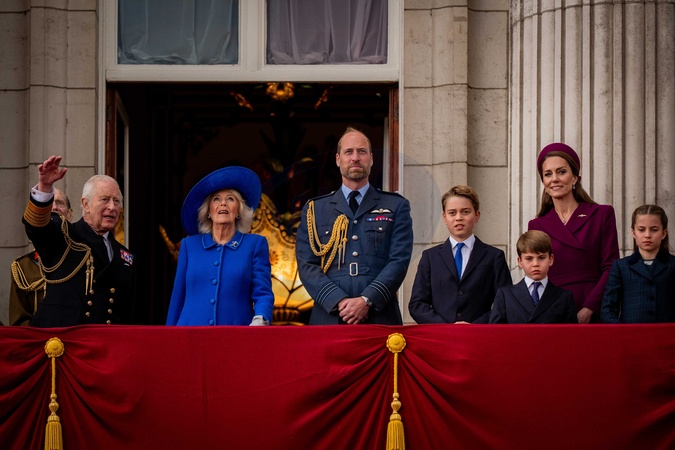(left to right) King Charles III, Queen Camilla, the Prince of Wales, Prince George, the Princess of Wales, Prince Louis and Princess Charlotte on the balcony of Buckingham Palace, London, to view the fly past featuring the Royal Air Force's Red Arrows and current and historic military aircraft, at the end of the military procession marking the 80th anniversary of VE Day, and in honour of those who served during the Second World War. Picture date: Monday May 5, 2025. PA Photo. The military fly past includes a Voyager transport, a P8 Poseidon, Typhoon and F-35 fighter jets, along with historic Second World War-era aircraft from the Royal Air Force Battle of Britain Memorial Flight, culminating with the iconic red, white, and blue smoke of the Royal Air Force's Red Arrows, bringing to an end the military procession for Victory in Europe Day, which is celebrated each year on May 8, marking the day the Allies formally accepted Germany's surrender in 1945. See PA story MEMORIAL VEDay., Credit:Aaron Chown / Avalon