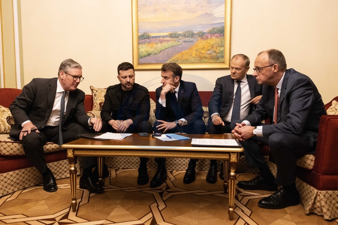 10/05/2025. Kyiv, Ukraine. Prime Minister Keir Starmer, Emmanuel Macron, French President, and Friedrich Merz, German Chancellor Poland Prime Minister Donald Tusk and Volodymyr Zelenskyy, President of Ukraine call US President Donald Trump on the phone during a visit to Ukraine., Credit:Simon Dawson / Avalon
