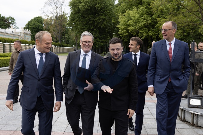 10/05/2025. Kyiv, Ukraine. Prime Minister Keir Starmer, Emmanuel Macron, French President, and Friedrich Merz, German Chancellor Poland Prime Minister Donald Tusk meets with Volodymyr Zelenskyy, President of Ukraine during a visit to Ukraine., Credit:Simon Dawson / Avalon