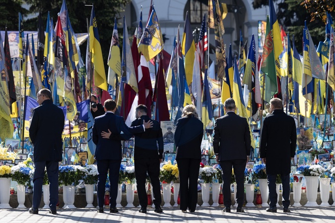 10/05/2025. Kyiv, Ukraine. Prime Minister Keir Starmer, Emmanuel Macron, French President, and Friedrich Merz, German Chancellor and Poland Prime Minister Donald Tusk and Volodymyr Zelenskyy, President of Ukraine attend a candle ceremony at Maidan Square during a visit to Ukraine., Credit:Simon Dawson / Avalon