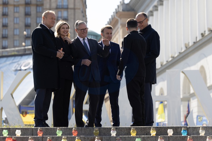 10/05/2025. Kyiv, Ukraine. Prime Minister Keir Starmer, Emmanuel Macron, French President, and Friedrich Merz, German Chancellor and Poland Prime Minister Donald Tusk and Volodymyr Zelenskyy, President of Ukraine attend a candle ceremony at Maidan Square during a visit to Ukraine., Credit:Simon Dawson / Avalon