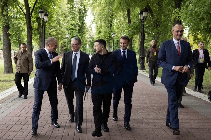 10/05/2025. Kyiv, Ukraine. Prime Minister Keir Starmer, Emmanuel Macron, French President, and Friedrich Merz, German Chancellor Poland Prime Minister Donald Tusk meets with Volodymyr Zelenskyy, President of Ukraine during a visit to Ukraine., Credit:Simon Dawson / Avalon