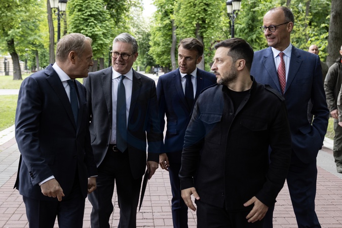 10/05/2025. Kyiv, Ukraine. Prime Minister Keir Starmer, Emmanuel Macron, French President, and Friedrich Merz, German Chancellor Poland Prime Minister Donald Tusk meets with Volodymyr Zelenskyy, President of Ukraine during a visit to Ukraine., Credit:Simon Dawson / Avalon