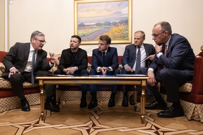 10/05/2025. Kyiv, Ukraine. Prime Minister Keir Starmer, Emmanuel Macron, French President, and Friedrich Merz, German Chancellor Poland Prime Minister Donald Tusk and Volodymyr Zelenskyy, President of Ukraine call US President Donald Trump on the phone during a visit to Ukraine., Credit:Simon Dawson / Avalon