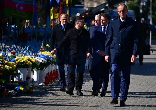 Donald Tusk, le Premier ministre polonais, Keir Starmer, le Premier ministre britannique, Olena Zelenska et son mari Volodymyr Zelensky, le président ukrainien, le président français Emmanuel Macron et le chancelier allemand Friedrich Merz - D.Tusk, le Premier ministre polonais, K.Starmer, le Premier ministre britannique, V.Zelensky, le président ukrainien, le président français E.Macron et le chancelier allemand F.Merz lors de la Commémoration des victimes de la guerre sur la place Maïdan à Kiev, le 10 mai 2025. Les quatre chefs d'État et de gouvernement sont venus plaider en faveur d'un cessez-le-feu de 30 jours dans la guerre russo-ukrainienne. © Christian Liewig / Bestimage D. Tusk, Polish Prime Minister K. Starmer, British Prime Minister V. Zelensky, Ukrainian President E. Macron, French President and German Chancellor F. Merz at the War Victims Memorial on Maidan Square in Kyiv on May 10, 2025. The four heads of state and government want to advocate for a 30-day ceasefire in the Russo-Ukrainian war.