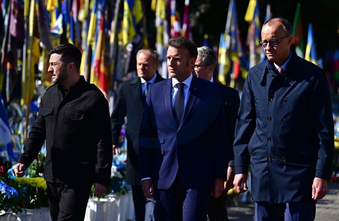 Donald Tusk, le Premier ministre polonais, Volodymyr Zelensky, le président ukrainien, le président français Emmanuel Macron et le chancelier allemand Friedrich Merz - D.Tusk, le Premier ministre polonais, K.Starmer, le Premier ministre britannique, V.Zelensky, le président ukrainien, le président français E.Macron et le chancelier allemand F.Merz lors de la Commémoration des victimes de la guerre sur la place Maïdan à Kiev, le 10 mai 2025. Les quatre chefs d'État et de gouvernement sont venus plaider en faveur d'un cessez-le-feu de 30 jours dans la guerre russo-ukrainienne. © Christian Liewig / Bestimage D. Tusk, Polish Prime Minister K. Starmer, British Prime Minister V. Zelensky, Ukrainian President E. Macron, French President and German Chancellor F. Merz at the War Victims Memorial on Maidan Square in Kyiv on May 10, 2025. The four heads of state and government want to advocate for a 30-day ceasefire in the Russo-Ukrainian war.