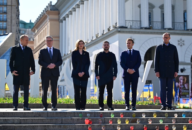 Donald Tusk, le Premier ministre polonais, Keir Starmer, le Premier ministre britannique, Olena Zelenska et son mari Volodymyr Zelensky, le président ukrainien, le président français Emmanuel Macron et le chancelier allemand Friedrich Merz - D.Tusk, le Premier ministre polonais, K.Starmer, le Premier ministre britannique, V.Zelensky, le président ukrainien, le président français E.Macron et le chancelier allemand F.Merz lors de la Commémoration des victimes de la guerre sur la place Maïdan à Kiev, le 10 mai 2025. Les quatre chefs d'État et de gouvernement sont venus plaider en faveur d'un cessez-le-feu de 30 jours dans la guerre russo-ukrainienne. © Christian Liewig / Bestimage D. Tusk, Polish Prime Minister K. Starmer, British Prime Minister V. Zelensky, Ukrainian President E. Macron, French President and German Chancellor F. Merz at the War Victims Memorial on Maidan Square in Kyiv on May 10, 2025. The four heads of state and government want to advocate for a 30-day ceasefire in the Russo-Ukrainian war.