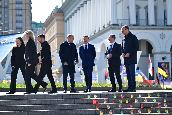 Donald Tusk, le Premier ministre polonais, Keir Starmer, le Premier ministre britannique, Olena Zelenska et son mari Volodymyr Zelensky, le président ukrainien, le président français Emmanuel Macron et le chancelier allemand Friedrich Merz - D.Tusk, le Premier ministre polonais, K.Starmer, le Premier ministre britannique, V.Zelensky, le président ukrainien, le président français E.Macron et le chancelier allemand F.Merz lors de la Commémoration des victimes de la guerre sur la place Maïdan à Kiev, le 10 mai 2025. Les quatre chefs d'État et de gouvernement sont venus plaider en faveur d'un cessez-le-feu de 30 jours dans la guerre russo-ukrainienne. © Christian Liewig / Bestimage D. Tusk, Polish Prime Minister K. Starmer, British Prime Minister V. Zelensky, Ukrainian President E. Macron, French President and German Chancellor F. Merz at the War Victims Memorial on Maidan Square in Kyiv on May 10, 2025. The four heads of state and government want to advocate for a 30-day ceasefire in the Russo-Ukrainian war.