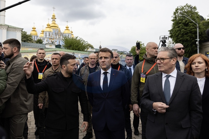 10/05/2025. Kyiv, Ukraine. Prime Minister Keir Starmer and Emmanuel Macron walk in the street with Volodymyr Zelenskyy, President of Ukraine during a visit to Ukraine., Credit:Simon Dawson / Avalon