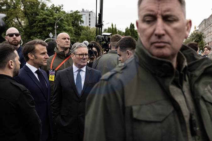 10/05/2025. Kyiv, Ukraine. Prime Minister Keir Starmer and Emmanuel Macron walk in the street with Volodymyr Zelenskyy, President of Ukraine during a visit to Ukraine., Credit:Simon Dawson / Avalon