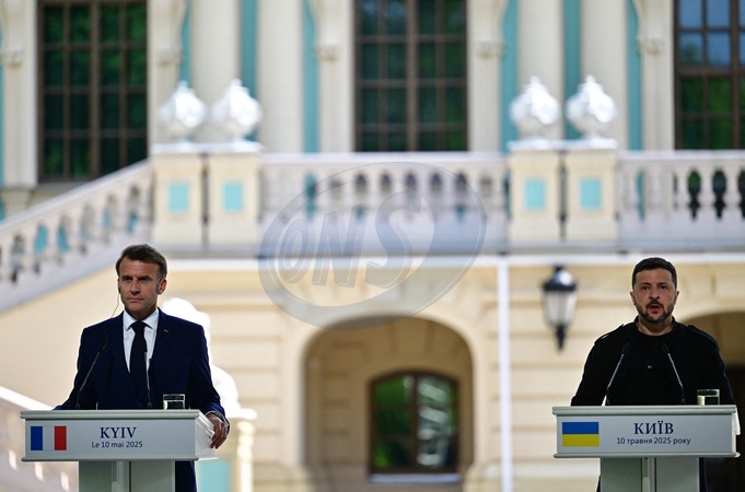 Emmanuel Macron, Friedrich Merz, Keir Starmer, Donald Tusk et Voloydmyr Zelensky donnent une conférence de presse à l'issue de la Coalition des Volontaires à Kiev, le 10 mai 2025. Cette conférence de la Coalition des Volontaires a pour objectif de soutenir l'Ukraine et à contribuer à assurer l'avenir de l'Europe et de l'Ukraine. Le but recherché était l'instauration d'un cessez-le-feu de 30 jours pour soutenir les négociations de paix avec la Russie. © Christian Liewig / Bestimage Emmanuel Macron, Friedrich Merz, Keir Starmer, Donald Tusk, and Voloydmyr Zelensky give a press conference following the Coalition of the Willing in Kyiv on May 10, 2025. The conference aims to support Ukraine and help secure the future of Europe and Ukraine. The goal was to establish a 30-day ceasefire to advance peace negotiations with Russia.