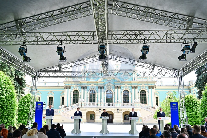 Emmanuel Macron, Friedrich Merz, Keir Starmer, Donald Tusk i Wołodymyr Zełenski na konferencji prasowej po Koalicji Chętnych w Kijowie
