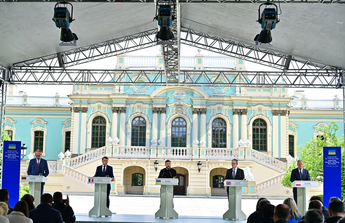 Emmanuel Macron, Friedrich Merz, Keir Starmer, Donald Tusk et Voloydmyr Zelensky donnent une conférence de presse à l'issue de la Coalition des Volontaires à Kiev, le 10 mai 2025. Cette conférence de la Coalition des Volontaires a pour objectif de soutenir l'Ukraine et à contribuer à assurer l'avenir de l'Europe et de l'Ukraine. Le but recherché était l'instauration d'un cessez-le-feu de 30 jours pour soutenir les négociations de paix avec la Russie. © Christian Liewig / Bestimage Emmanuel Macron, Friedrich Merz, Keir Starmer, Donald Tusk, and Voloydmyr Zelensky give a press conference following the Coalition of the Willing in Kyiv on May 10, 2025. The conference aims to support Ukraine and help secure the future of Europe and Ukraine. The goal was to establish a 30-day ceasefire to advance peace negotiations with Russia.
