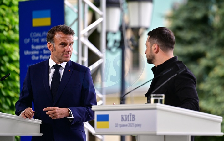 Emmanuel Macron, Friedrich Merz, Keir Starmer, Donald Tusk et Voloydmyr Zelensky donnent une conférence de presse à l'issue de la Coalition des Volontaires à Kiev, le 10 mai 2025. Cette conférence de la Coalition des Volontaires a pour objectif de soutenir l'Ukraine et à contribuer à assurer l'avenir de l'Europe et de l'Ukraine. Le but recherché était l'instauration d'un cessez-le-feu de 30 jours pour soutenir les négociations de paix avec la Russie. © Christian Liewig / Bestimage Emmanuel Macron, Friedrich Merz, Keir Starmer, Donald Tusk, and Voloydmyr Zelensky give a press conference following the Coalition of the Willing in Kyiv on May 10, 2025. The conference aims to support Ukraine and help secure the future of Europe and Ukraine. The goal was to establish a 30-day ceasefire to advance peace negotiations with Russia.